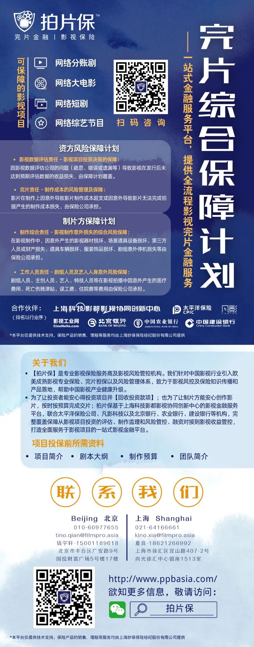 【拍片保】结合市场需求在国内做一部分的“人设崩塌保险”,由国内保险公司承接,能转嫁相当一大部分的风险。最近已经有很多知名大制作的影视剧配置了“人设崩塌保险”,并且都对于【拍片保】推出的国内首个“人设崩塌保险”表示了极大的肯定!